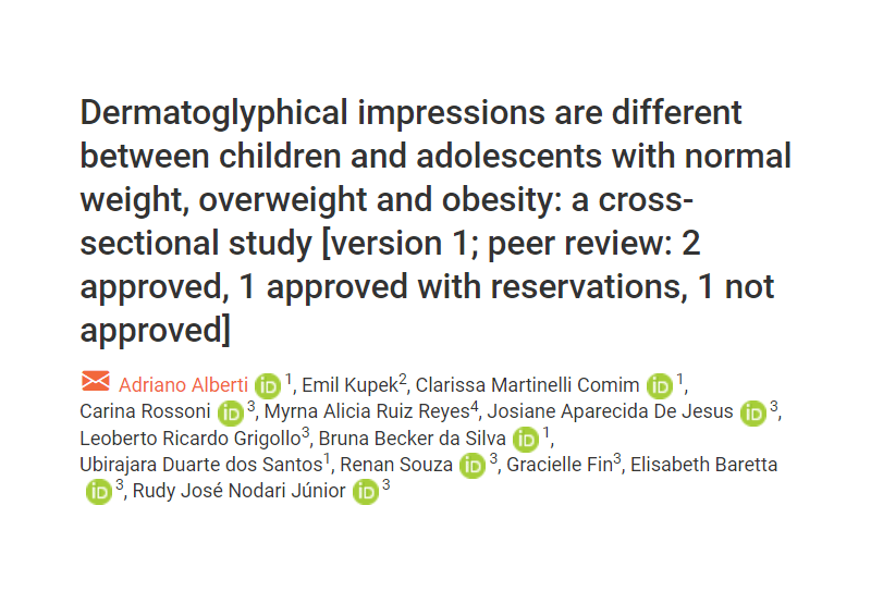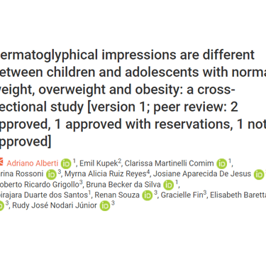 Methods: The sample comprised of 2,172 children and adolescents aged 10 to 19 years old of both sexes and from public and private teaching networks. Results: The results suggested a predictive marker of obesity, with a greater number of lines in left hand finger two (Mesql2) and a higher frequency of the whorl pattern in participants of a healthy weight, while the overweight group had a higher frequency of the radial loop pattern and the obese group had a higher frequency of the ulnar loop pattern.